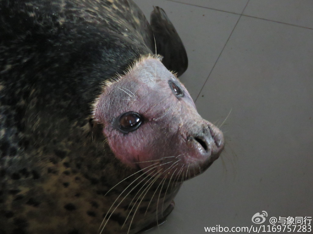 杭州極地海洋公園被網友爆料是「海豹地獄」,因為海豹生活在惡臭中,罹患嚴重皮膚病,臉部褪毛、鼻孔流膿(上圖/取自微博,下同)。園內曾經有19隻斑海豹,現在只剩下10隻。不過,園方否認虐待海豹。