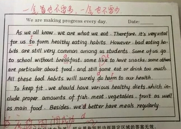河北衡水中學學生「手寫」的英文作文最近在網路上曝光,字跡簡直像印刷字體一樣,引起許多網友討論。不過在「神話」的背後則是近乎變態的教育方式,從學生作文的批改痕跡可以發現,只要字母長度不對,就會直接被認為是單字錯誤。