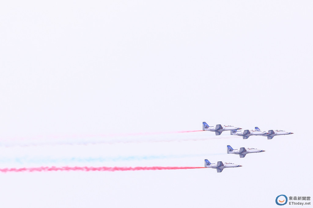 另外,眾所矚目的則是空軍雷虎小組,下午2時左右也進行試飛,雷虎小組成員駕駛AT-3教練機,以5架戰機編成大雁陣型,噴發出紅、白、藍三色煙霧,以高度330公尺,時速450公里,飛過總統府上空。