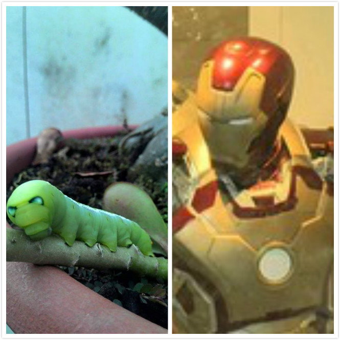 電影中的鋼鐵人最常受注目的就是全身鋼鐵裝,以及那會發光的眼睛,而現在也出現了綠色毛毛蟲版,網友照片一出,大家紛紛留言,「綠能標章的鋼鐵人! 」「一臉狠角色!」「本人感覺應該很肥美!」「等等他伸出手來對著你。」不過也有人說,「只有是蟲都很害怕,我還是喜歡原來的鋼鐵人啦!」