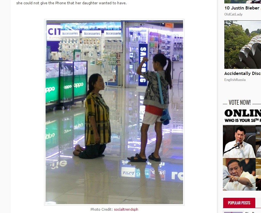 根據《Social Trendsph》網站報導,這起事件發生在芭達雅的Harbor 商場,由於家中經濟狀況不佳,這名母親甚至也買不起自己想要的東西,她對女兒說,她們沒有足夠的錢買她想要的手機,隨後便在女兒面前跪了下來,一直求她原諒;但15歲的女兒就站在那裡,沒有做任何事情,更沒有上前扶起她的母親,甚至大聲責備,令在場人士都看不下去。