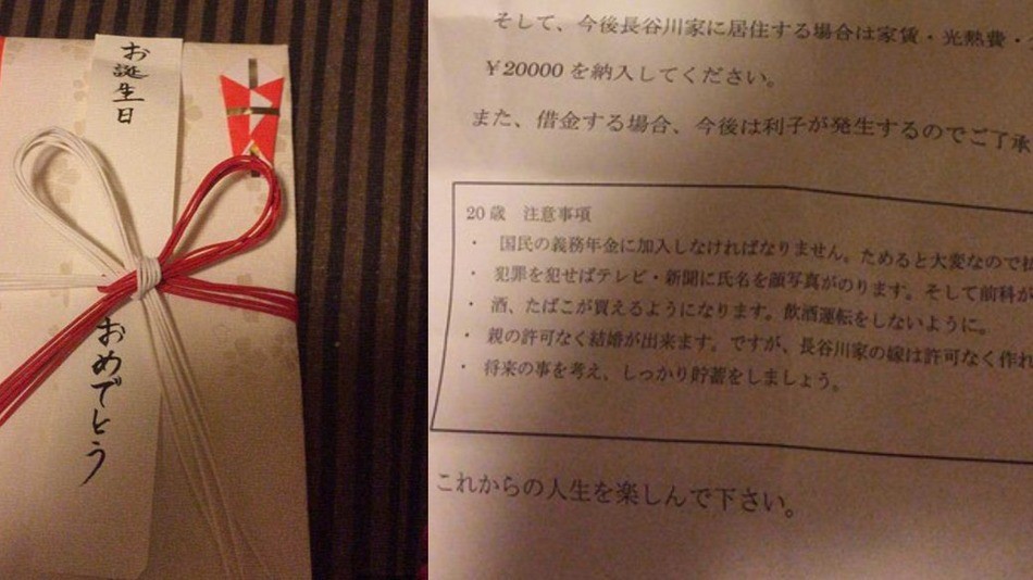 長谷川在生日當天收到來自父母的日式傳統祝儀袋,原本以為裡面會是鈔票,沒想到竟然是一張「通知書」,上面寫道,「10月4日起,父母的養育責任就此結束,今後請成為像父母一樣出色的大人。」並提到,未來若繼續住在家裡,每個月應該要負擔餐費、租金,以及水電費共2萬日元(約新台幣5400元);而且,要跟父母借錢的話,也是要算利息的喔!