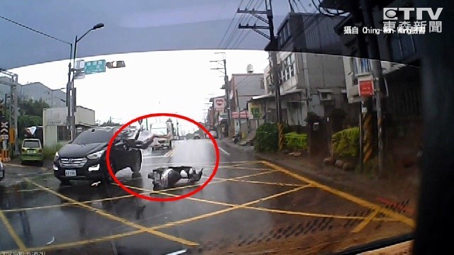 根據行車記錄器影像顯示,駕駛停在平交道路口,前方一名穿著雨衣、戴黑色安全帽的騎士靠右停下,準備往平交道的方向左轉,看見轎車駕駛停車禮讓,就直接往前開,未料下一秒就出事。
