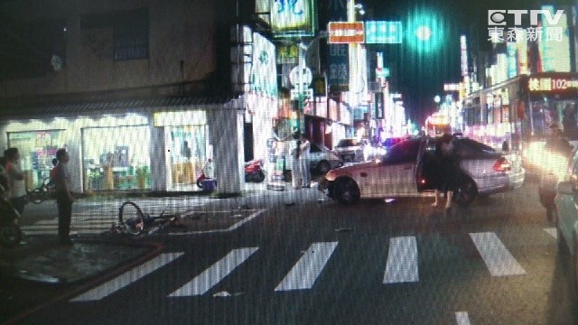 從監視器畫面可以看到,銀色轎車準備要左轉時,直行機車疑似是車速過快,看到轎車時已經反應不及,當場撞上,撞擊力道之大,連人帶車從轎車右側彈飛到左側,距離大概有3公尺遠!而且當時轎車左方還有一輛腳踏車路過,也無端遭到波及,騎腳踏的民眾被撞到跌坐在地,轎車的車頭嚴重毀損,保險桿都掉落了,最後機車卡在一旁店家門口才停下。