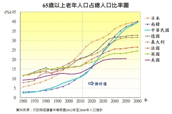 台灣老化步調有多快?經建會推算,台灣只要短短7年,就會從高齡社會進入超高齡社會,速度領先其他先進國家。10年後的台灣,65歲以上人口將增加178萬人;每5人就有1人超過65歲,老年人口也會是幼年人口一倍。而扶老比也會增加近一倍,平均每3個工作人口,就要扶養1個老人。