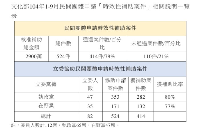 文化部表示,104年度編列的補助款計有19.63億,目前核准的補助款約2900多萬;1月到9月共有524件申請案,核准通過的有414件。另外,共有82名立委協助民間團體申請即時性補助案件,當中有47位國民黨立委、35位民進黨立委。文化部進一步分析數據,國民黨協助申請件數353件、獲補助282件,通過率80%;民進黨協助申請件數171件、獲補助132件通過率,77%。根據統計數據,國民黨及民進黨協助申請案件通過的比率差不多,證明並未獨厚特定政黨或委員。