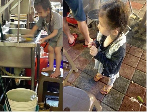照片中的妹妹看起來只有小一、小二年紀,為了分擔夜市父母的辛勞,主動幫忙清洗收拾。雖然身高不夠高,還碰不太到洗手槽,她乾脆拿來一張塑膠椅,自己赤著腳丫子站在上頭,半彎著身子,抓起黃色菜瓜布認真擦洗,幹起活來也是有模有樣。