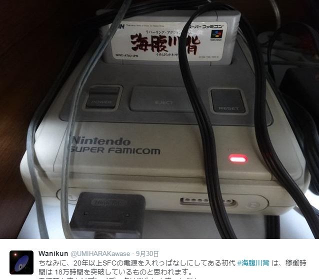超級任天堂陪伴許多七、八年級生走過童年,當時也是卡帶遊戲的巔峰時期,創造出許多相當經典的遊戲。日本推特網友Wanikun就在9月30日PO出一張超任的照片引發討論,因為他為了一款1994年發行的遊戲《海腹川背》,竟然就犧牲一台超任主機去運行遊戲整整20年,直到現在依然沒有關機。