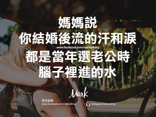 臉書粉絲頁「Mark語錄」,日前分享了一段話,引發上萬名網友分享按讚,內容這樣寫道「媽媽說,你結婚後流的汗和淚,都是當年選老公時,腦子裡進的水!」並且還留言提到「哈哈哈哈~~要好好選啊!」
