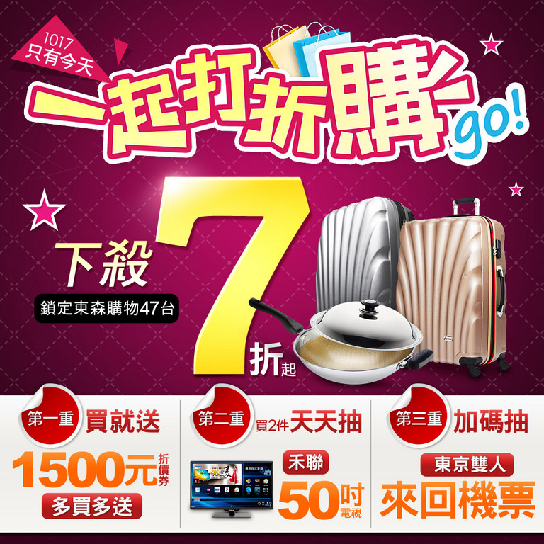 百貨公司、電視購物、網路購物業者在週年慶期間優惠盡出,東森購物特別集結消費大眾在電視購物上瘋買的商品,10月17日於47台企畫「一起打折購」特別日活動,當天商品全部下殺7折起。