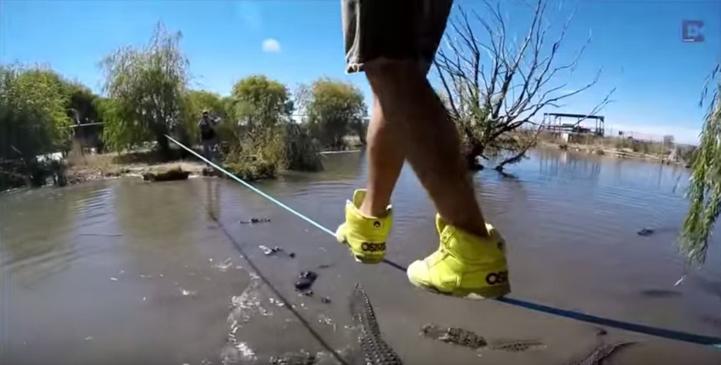 ▲男子挑戰在鱷魚池上走繩索。(圖/翻攝自YouTube)