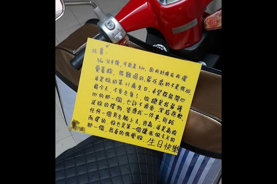 一名羅姓網友16日在「爆料公社」貼文,表示她去樓下牽車時,意外發現隔壁機車上堆著大件物事,原來是「床罩組」,接著又瞄到一張黃色板子,上頭寫滿對前女友祝福的話語,「覺得好痴情」。