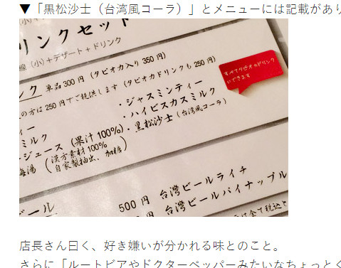 網友鹿乃ハル說,在日本的「台灣麵線」餐廳的菜單上,看到了黑松沙士的名字,並註明是台灣可樂,讓他好奇地點來喝喝看,入口後有種懷念的感覺,但仔細思索後卻發現是中藥貼布的味道,感嘆「真是一個具有衝擊性的飲料啊。」