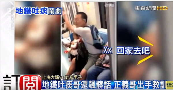這也太沒公德心了吧!大陸上海地鐵日前有一名男子,在車廂內隨地吐痰,有女乘客看不下去出言指責,不料男子卻不知悔改,甚至還口出穢言辱罵其他乘客,引起車廂內所有乘客群情激憤,有名黑衣男子出面毆打這名吐痰男,事後影片上傳網路,大多數網友痛罵吐痰男,並為黑衣男子行徑拍手叫好。