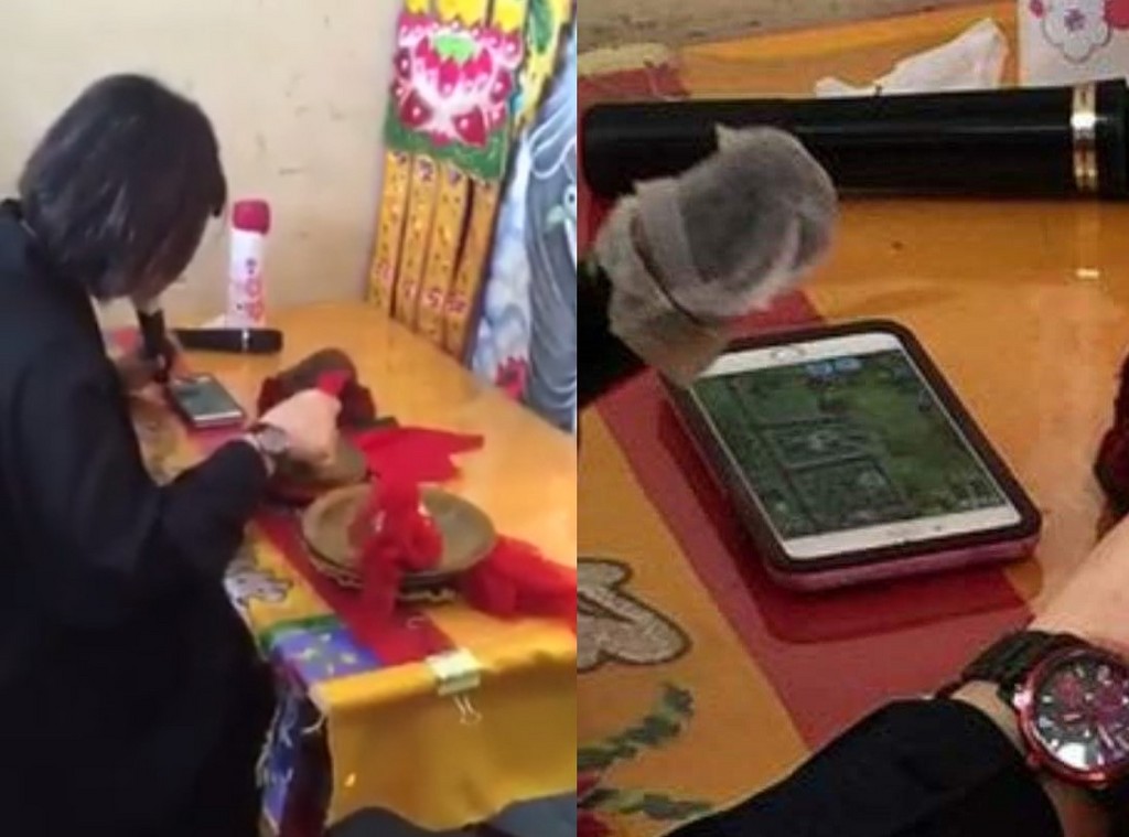 影片中,女師父右手敲鈸,左手拿麥克風誦經,但頭低低的,原來左手小拇指在滑手機。原PO也貼出照片,發現女法師的手機螢幕是遊戲的畫面。