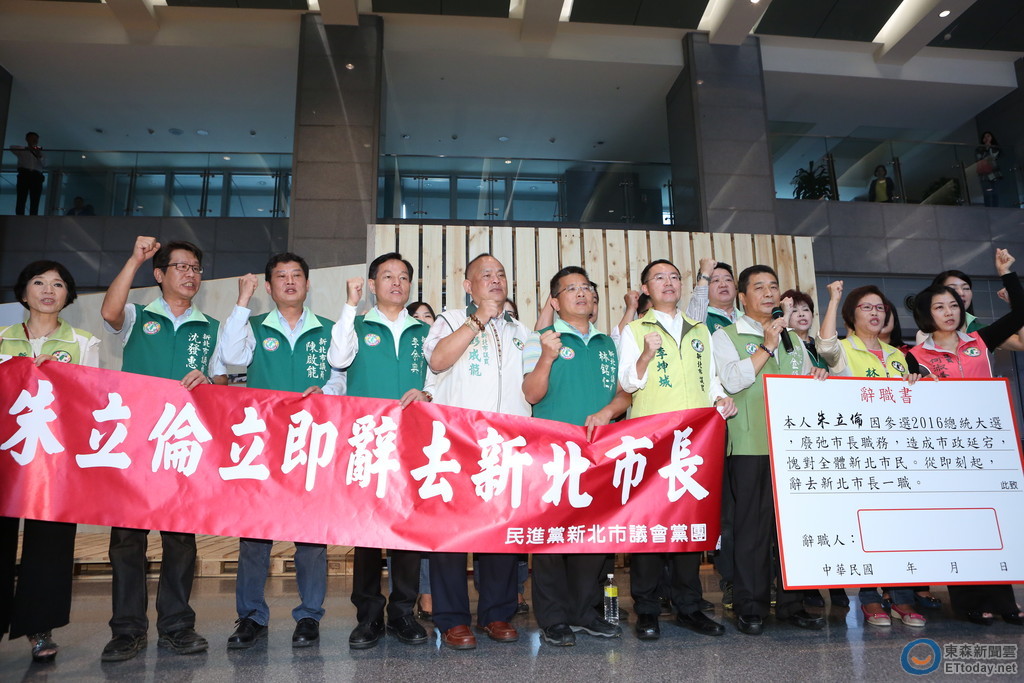 新北市長朱立倫19日宣布帶職參選2016總統,民進黨新北市議會黨團隨即召開記者會,要求朱立倫即刻辭職,黨團還替朱準備「辭職書樣本」,在記者會後直接上到市長辦公室,由副市長陳伸賢代收。民進黨團總召集人鄭金隆說,黨團不承認朱立倫的請假效力,要求朱立倫在28日的市政總質詢銷假上班備詢。