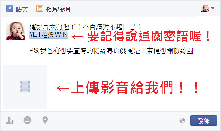 ▼②參加ET哈樂WIN臉書活動,留言上傳你的影音,並標記通關密語 # ET哈樂WIN ,簡述影音內容(或想宣傳的粉絲專頁)。