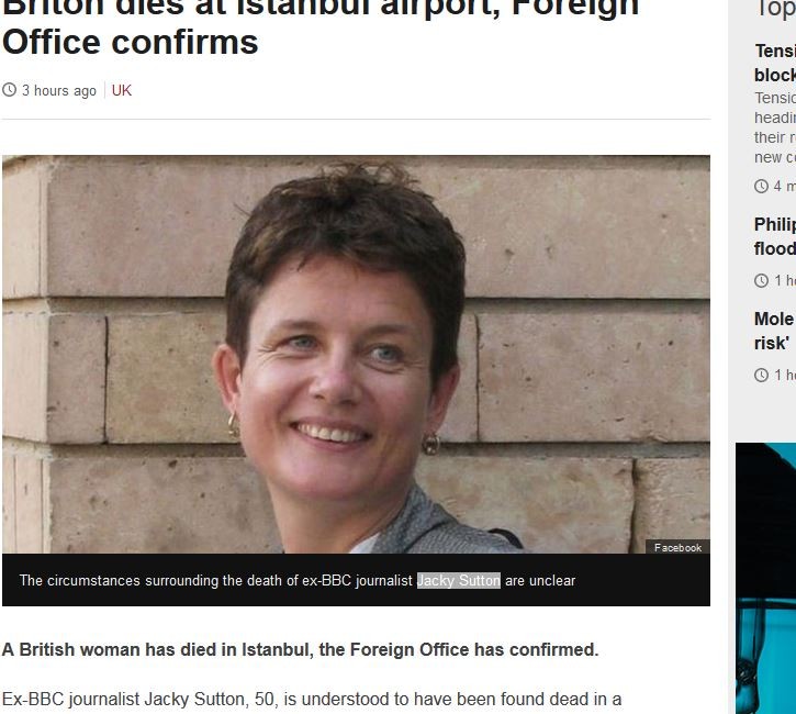 英國廣播公司(BBC)前記者沙頓(Jacqueline Anne Sutton)疑似因錯過從伊斯坦堡到伊拉克庫德族自治區首府阿比爾(Erbil)的班機,導致心情低迷,而在土耳其阿塔圖克機場(Ataturk Airport)洗手間用鞋帶上吊。此一事件幾近「被自殺」,所以遭到她身邊友人的質疑與不相信。