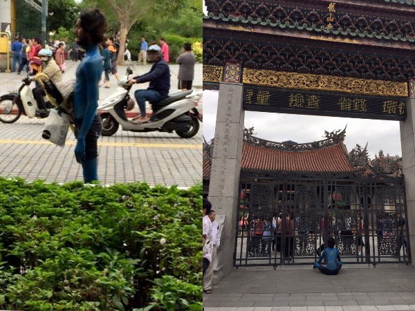 網友們不約而同在「爆料公社」貼此景象,照片中,一名捲髮留著長鬍子的外國男子,全身只穿短褲,塗滿藍色顏料,在龍山寺門口徘徊,許多路人看傻眼直盯著瞧,但似乎沉浸在自己的世界,絲毫不在乎其他民眾目光。