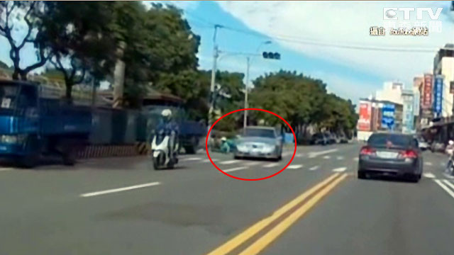 從另一個角度來看,銀色轎車原本直線往前開,卻在接近郵務士時突然往右邊偏,撞上剛起步的郵務士,隨後又趕緊打正,接著肇事逃逸。
