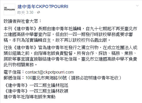 ▲建中青年社宣布《建中青年》脫離校刊!(圖/翻攝自建中青年CKPOTPOURRI粉絲專頁)