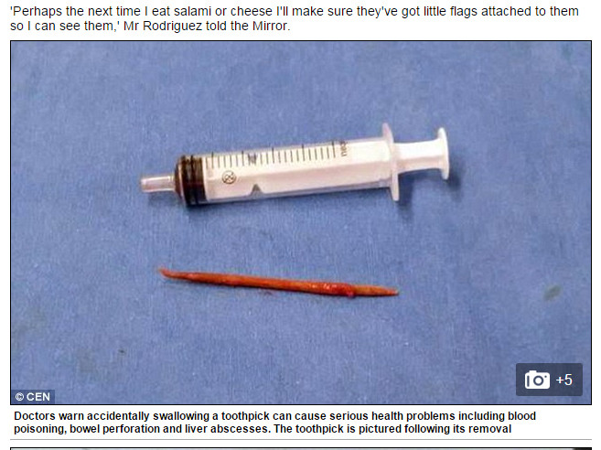 阿根廷42歲男子羅德里奎茲(Horacio Rodriguez)因為心臟劇烈疼痛求診,竟發現在他的心臟裡有一根完整的牙籤,醫生說,牙籤必須通過他的食道才能進入心臟,或者是通過上腔靜脈,大靜脈,並經過頭部、手臂最才會後進到心臟。牙籤通過層層血管,都沒有任何損壞,讓人相當詫異。