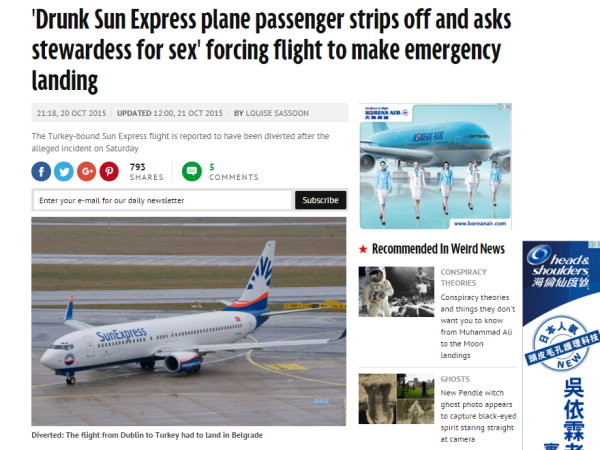 根據英國《鏡報》(The Mirror)報導,日前歐洲廉航「太陽快捷」(Sun Exprss)一班由都柏林飛往土耳其伊茲密爾市的班機,一名愛爾蘭籍的男子疑似喝醉了,就在機艙內脫光全身衣物,他的朋友們在一旁起鬨,接著男子還不斷地甩動自己的小弟弟,在空姐面前示愛。
