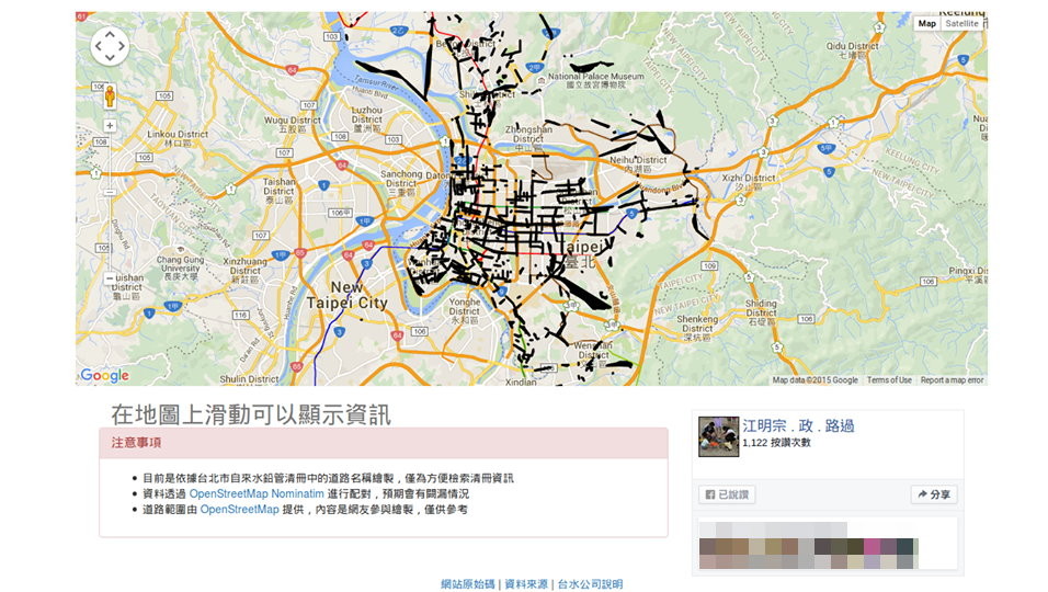 不過,江明宗也談到,目前資料的缺漏還很多,只是有個初步的雛型,先放上網路給大家參考,希望相關單位能夠釋出更完整的資料,讓市民早點知道自己生活周遭鉛管的分布情況。
