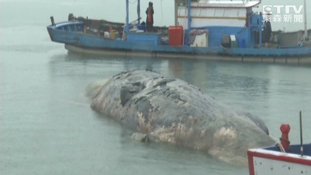在嘉義八掌溪出海口擱淺死亡的抹香鯨,22日上午7點多終於被3艘漁船拖回布袋商港,將轉運成大海洋生物暨鯨豚研究中心。