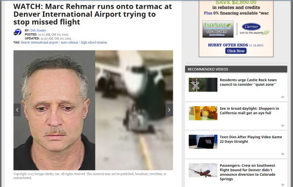 根據《The Denver Channel》報導,8月份時美國丹佛國際機場(Denver International Airport),一名58歲的男子馬克(Marc Rehmar),他因為錯過航班,看到班機正在跑道上等待起飛時,竟然直接衝到停機坪,用自己的「肉身」要阻止飛機起飛,相關人員看到後嚇出一身冷汗。