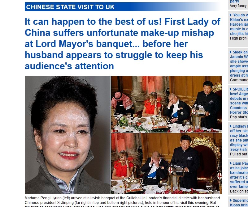 這場「化妝事故」發生在21日彭麗媛出席倫敦市長的歡迎晚宴上。在早前能見的網友評論中,有人對此感到意外,也有人認為這並不影響彭麗媛的美麗形象。