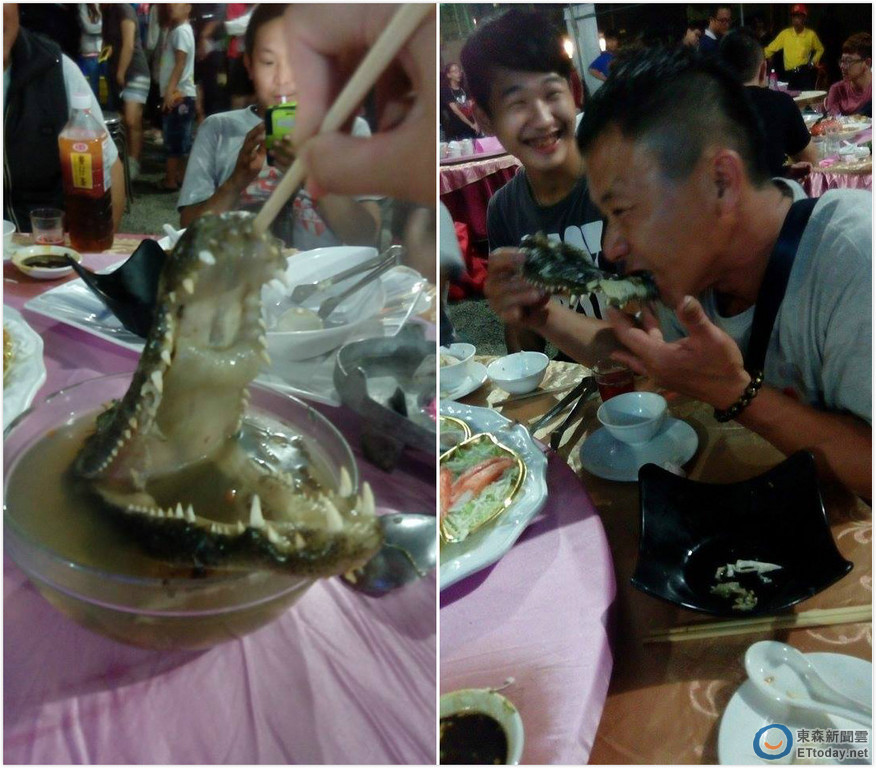 鱷魚肉其實營養價值很高,膠質含量豐厚,能養顏美容。不過直接將鱷魚頭端上桌還是少見,因此照片PO上網引起熱議,「好可怕!」、「太威猛了!」、「真的是什麼都可以吃!什麼都不奇怪!」