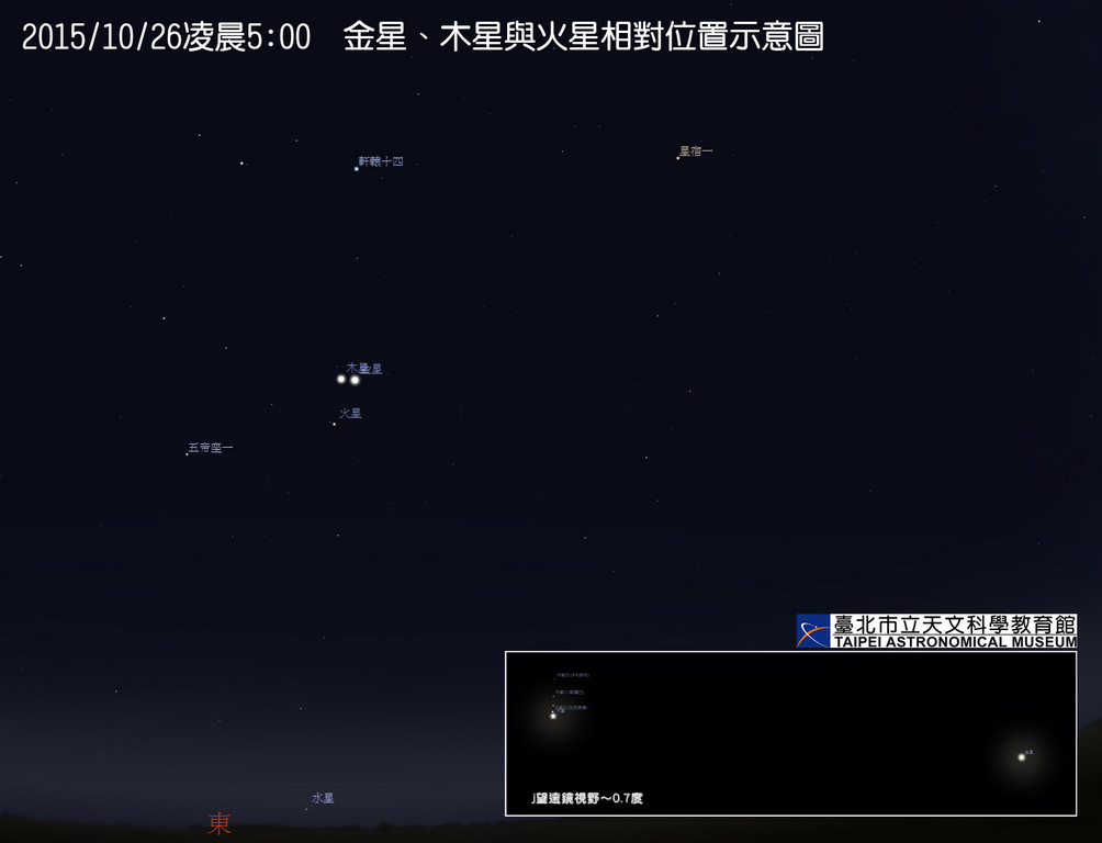 台北市立天文科學教育館指出,其中最亮的金星和次亮的木星,於26日最接近相距僅1.1度而已,-4.5等亮的金星在右,-1.8等次亮的木星在左,+1.7等的紅色火星則在這兩星下方約3.5度遠更接近地面。►►►傳送第一手的新聞,鎖定《ET即時》粉絲團就對了!