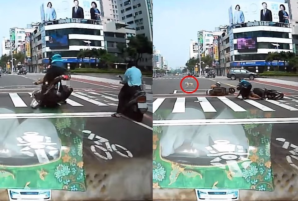 高雄市四維路和中山路口25日發生一起離譜車禍,一輛雙載機車疑沒注意到紅燈,完全沒煞車撞上前方一輛機車,造成兩車3人倒地、1狗嚇到跑走。有民眾將行車記錄器影片PO網,大罵「太誇張了,這樣也能撞,鬼遮眼了嗎?」
