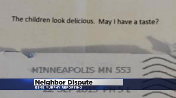 根據美國《WCCO-TV》報導,38歲的波諾拉(Carrie Pernula)不滿鄰居家2名上小學的孩子吵鬧,還時常將東西丟進她的庭院,於是透過郵件寄出一份雜誌,並在信封上頭寫「你們家小孩看起來很好吃,我可以嚐嚐看嗎?」