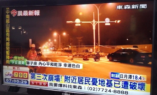 位於竹北市莊敬北路與勝利11路的「浩瀚一品」建案工地,24日兩度發生模板坍塌意外導致3人受傷;沒想到26日晚間9時許,莊敬北路東邊的道路傳出第三度塌陷,就連人行道也被掏空,由於天色昏暗沒有人敢靠近確認,從外圍目測坍塌面積長約10公尺、寬3公尺。