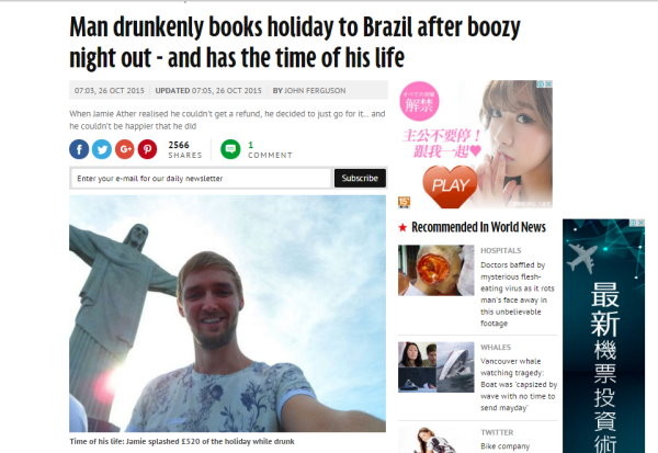 英國一名銀行職員,日前買機票要返家,當天卻喝得爛醉而買錯機票,酒醒之後發現自己竟然買了一張到巴西的航班,而且已經過了退票時限,他決定「將錯就錯」,來一趟南美之旅。