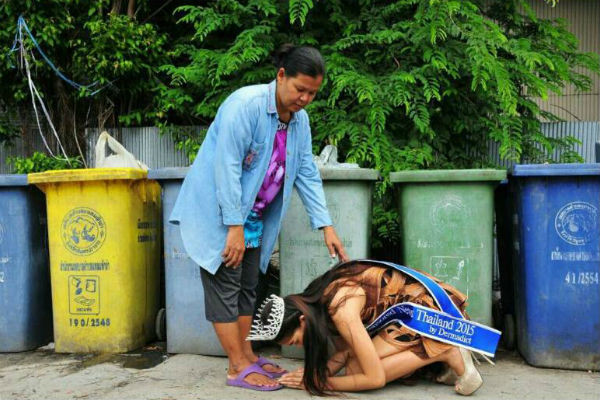▲媽媽撿垃圾讓她念書,泰國選美冠軍跪地拜謝。(圖/翻攝自MTHAI NEWS/下同)