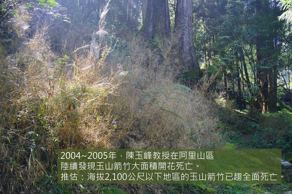 李根政也說,近半世紀,台灣並無玉山箭竹大面積開花死亡的紀錄,直到2004年12月陳玉峰教授發現阿里山區的玉山箭竹開花,又在2004、2005年間,發現海拔2,100公尺以下地區的已趨全面死亡。到今年中,全阿里山森林遊樂區的精華區域,林下的玉山箭竹幾乎全面枯乾。玉山箭竹一旦大面積死亡,根系失去護土作用,表土遇水即遭沖刷,土壤流失情形將更加嚴重。