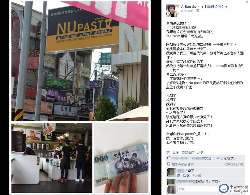 這名原PO在臉書社團「爆料公社」指出,實在不知道要怎麼感謝這些人,「謝謝你們Nu pasta的員工!我要祝你們生意興隆,員工們(平安喜樂),我一定會常光臨的,但不要再掉錢了XD」她還逗趣的問,可以請市長頒發「模範店家」獎牌給他們嗎?