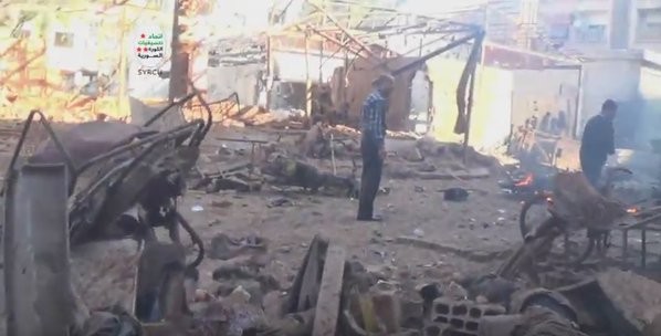 ▲敘利亞政府軍30日對大馬士革市場與附近城鎮發射12枚火箭炮,造成至少40人死亡。(圖/翻攝自Twitter)