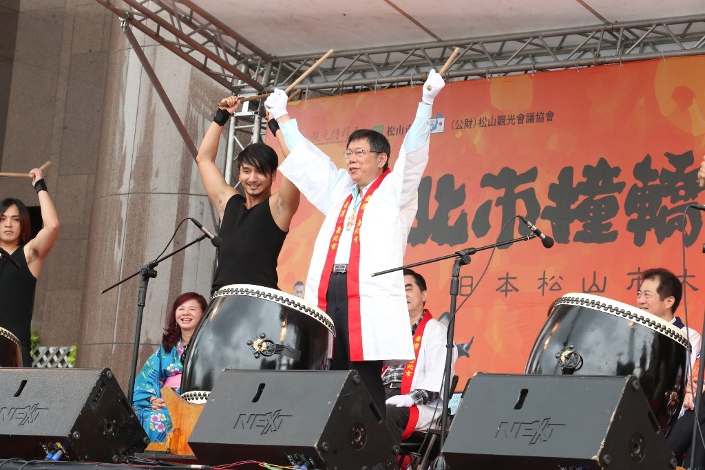 柯文哲及3位副市長、日本松山野志市長、愛媛縣中村知事等人今日都穿上短掛、登轎專用鞋,一同登轎出場,柯P還化身「太鼓達人」,率領「台北極鼓擊」擊鼓演出。