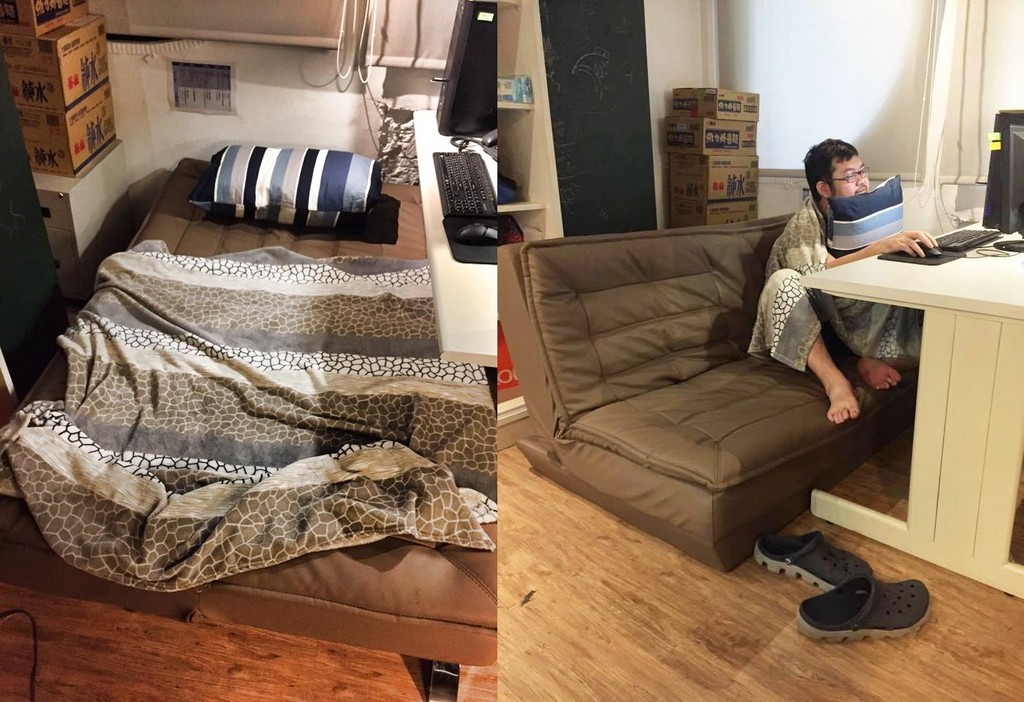 網路名人四叉貓(劉宇、XXXXGAY)2日發文,表示原本辦公室的椅子是破舊的電腦椅,實在很難坐,於是他取得部門主管的同意,准許自行準備喜歡的椅子。有創意的四叉貓於是搬了組沙發床到辦公室放,還準備了小毛毯和枕頭,可以舒服睡午覺,甚至堆了數箱礦泉水和維力泡麵,簡直就把公司當自家!