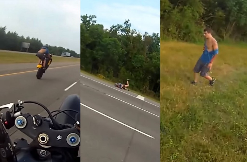 影片中,男子以超過100英里(約160公里)的速度在高速公路上狂飆,他先站在坐墊上,接著和車友一前一後「翹孤輪」,沒想到他只威風了8秒,前輪落地時失去平衡,急速左右搖晃2秒後,人不斷在柏油路上翻滾,重機則衝向一旁的樹叢。