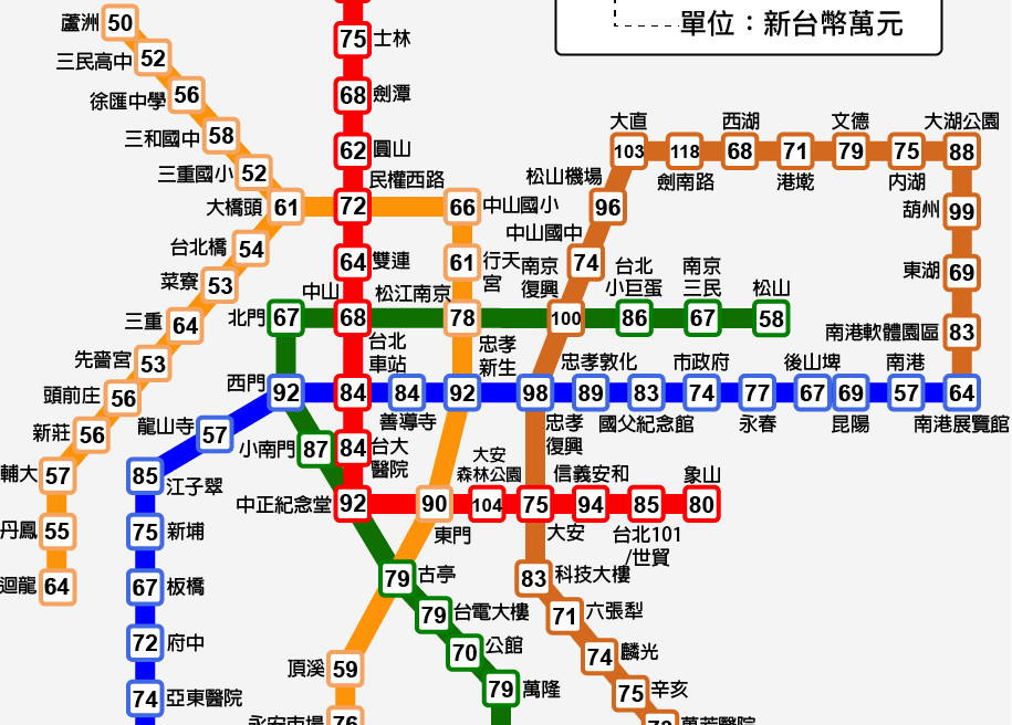 2014年統計我國每戶家庭平均所得為121.4萬元,高所得族群也傾向聚集於便利的交通和大眾運輸工具經過的地區,台北市有多個捷運站因有雙線經過被視為黃金地段,現在有一個數據搭配北捷路線圖告訴你每個捷運站附近住戶的平均收入,看出貧富差距。