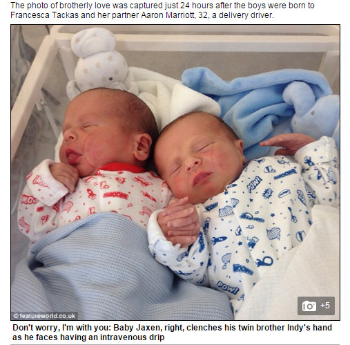 就在醫生向Tackas解釋療程的時候,Jaxen突然伸出小手握住弟弟,Indy也很自然的回握,他們就這樣十指緊扣地窩在一起,像是互相在加油打氣,這讓在場的每一個人都驚呆了!4天後,這對兄弟終於可以出院回家,而直到7個星期後的現在,他們還是常常手牽著手靠在一起,展現雙胞胎獨有的默契和親密的情誼。