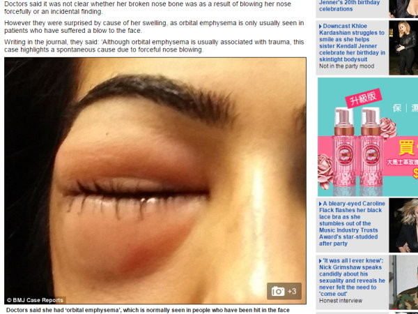 《英國醫學期刊》(British Medical Journal)則指出,眼眶氣腫多誘發於外傷,只是該女子的病例十分罕見,因此過度擤鼻涕也是可能會導致病情發作。