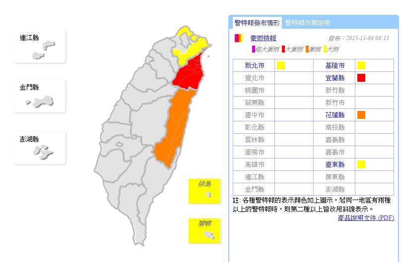 氣象局提醒,宜蘭縣4日會有局部大豪雨、花蓮縣局部豪雨發生;基隆北海岸、新北山區及蘭嶼、綠島則有大雨發生的機率,山區需慎防坍方及落石,並留意行車安全。
