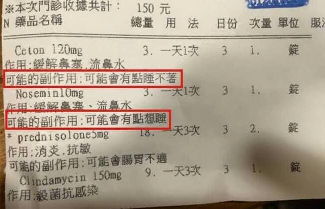 女網友上傳的圖片清楚顯示,裡頭共有4種藥品,其中一種的副作用是「可能會有點睡不著」、另一種則是「可能會有點想睡」,兩者加總起來,讓她不禁納悶:如果要一起服用,那到底是能不能睡著呢?