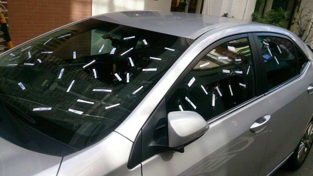 陳姓網友6日在爆料公社裡上傳幾張照片,表示自己經過迪化街附近時,看到一台汽車上面被貼滿小紙條,擋風玻璃、前後座的車窗等等全部無一倖免,靠近一看,還是用透明膠帶貼死的。